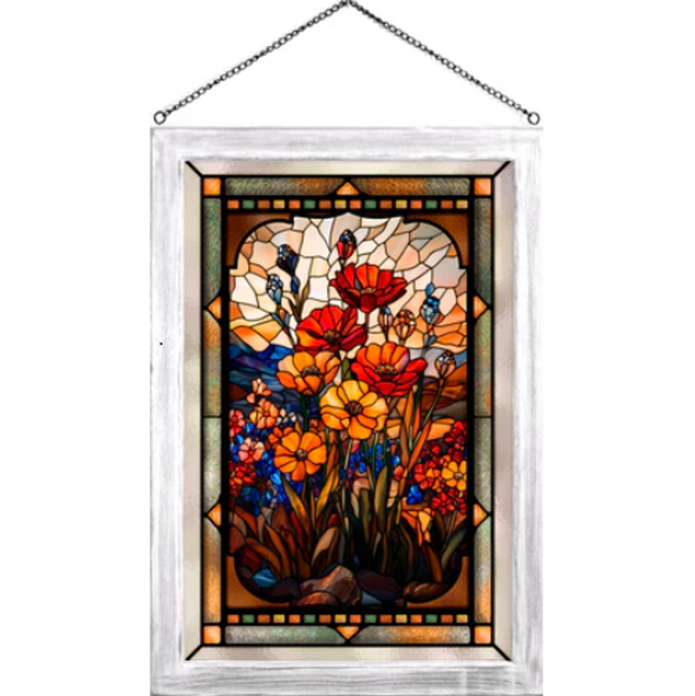 Let the light shine! Stained glass art hangings show their true colors when back-lit with natural sunlight. Classic images are printed with fade resistant inks directly on glass, framed, and ready to hang. Made in the USA!